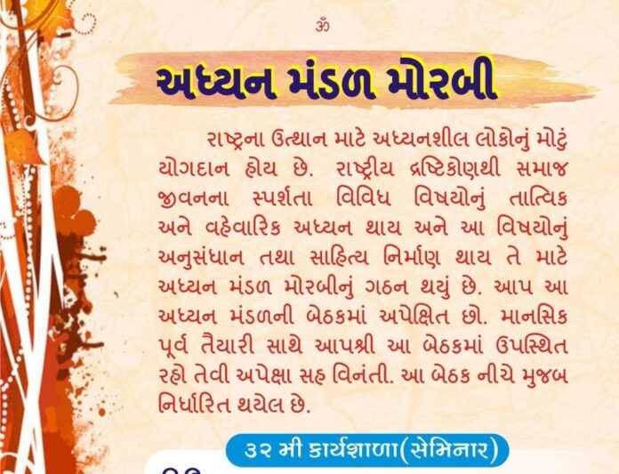રાષ્ટ્રના ઉત્થાન માટે અધ્યયનશીલ લોકોનું મોટું યોગદાન હોય છે.અધ્યયન મંડળ મોરબી દ્વારા હિન્દુ સંવત્સર મહિનાના ચોથા ગુરુવારે સમાજ જીવનના સ્પર્શતા જુદા જુદા વિષયોને લઈને એક સેમિનારમાં થાય છે. આ વખતે 30મી કાર્યશાળા (સેમિનાર) તારીખ ૨૦/૦૨/૨૦૨૫ ને ગુરુવાર ના રોજ રાત્રે ૯:૧૫ વાગ્યે મોરબીના ગાયત્રી ચેતના કેન્દ્ર, નવા હાઉસીંગ બોર્ડ, શનિદેવના મંદિર પાછળ યોજાશે
