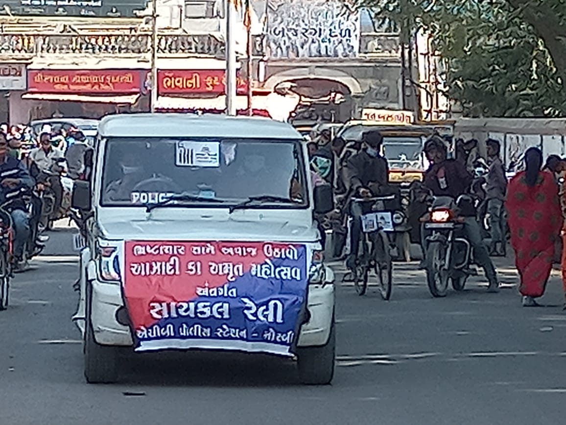 આઝાદી કા અમ્રુત મહોત્સવ અંતર્ગત આજરોજ મોરબી ટાઉનમાં એસીબી પોલીસ સ્ટેશન મોરબી દ્વારા એક સાયકલ રેલી નું આયોજન કરવામાં આવ્યું જે રેલી શહેરના મુખ્ય માર્ગ ઉપર ફરી 1064 તેમજ વિગતો સાથે ની પેમ્પલેટ નું વિતરણ કરી લોકોમાં ભ્રષ્ટાચાર સામે અવાજ ઉઠાવવા સમજ આપી લોકજાગૃતિ લાવવા પ્રયાસ કરાયો હતો. જાગૃત લોકો ભ્રષ્ટાચાર સામે આવાજ ઉઠાવે તેમજ ભ્રષ્ટાચાર નાબુદ થાય તે અંગે લોકજાગૃતિ ના પ્રયાસો મોરબી પોલીસ દ્વારા શહેર ના મુખ્ય માર્ગ પર રેલી કાઢી લોકજાગૃતિ નો એક અનેરો પ્રયાસ કરાયો હતો.