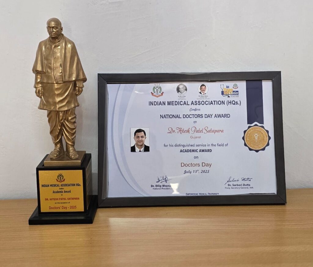 ઈન્ડીયન મેડિકલ એસોશિયેશન-નેશનલ બ્રાંચ દ્વારા રાષ્ટ્રીય કક્ષા નો બેસ્ટ એકેડેમિક એવોર્ડ મેળવતા મોરબી ઓમ કાન-નાક-ગળા ની હોસ્પીટલ ના તબિબ ડો.હિતેશ પટેલ