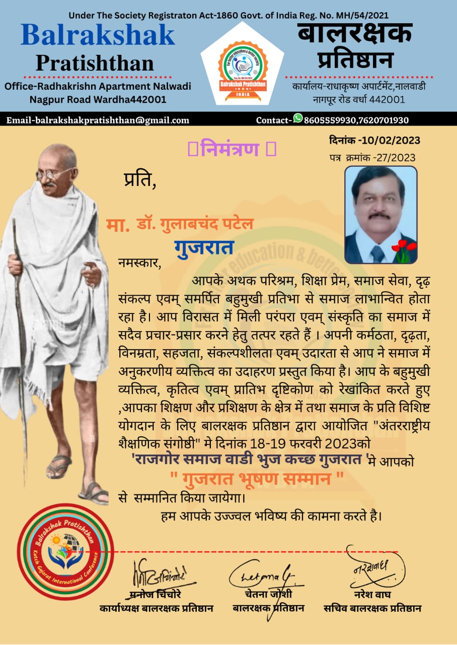 - ગુજરાત પાટનગર ગાંધીનગર સેક્ટર 14 મહાત્મા ગાંધી મંદિર પાસે અમદાવાદ ના વતની, પૂર્વ ઓફિસ સુપ્રિટેન્ડન્ટ જિલ્લા શિક્ષણાધિકારી કચેરી અમદાવાદ અને મહાત્મા ગાંધી સાહિત્ય સેવા સંસ્થા ગાંધી નગર ના રાષ્ટ્રીય અધ્યક્ષ, હિન્દી ગુજરાતી કવિ લેખક અને અનુવાદક, પત્રકાર , અથાગ પરિશ્રમ પ્રેમી, શિક્ષણ પ્રેમી, આનંદાલય શિક્ષણ સંસ્થા અમદાવાદ ના સાધક, સમાજ સેવા, સંકલ્પ પ્રેમી, ત્થા સમર્પિત બહુ મુખી પ્રતિભા થી સમગ્ર દેશ અને વિદેશ લાભ પ્રાપ્ત કરી રહ્યો છે, જેમના દ્વારા ભારતીય સંસ્કૃતિ અને પરંપરા ઓ નું સમાજ માં સદા પ્રચાર પ્રસાર કરવા માટે તત્પર રહેનાર, પોતાની કર્મઠતા, દ્રઢતા, વિનમ્રતા, સરળતા, સંકલ્પ શીલ, અને ઉદારતાથી સમાજ માં પ્રેરણાદાયી ઉદાહરણ પૂરું પાડનાર, આવી બહુ મુખી પ્રતિભા, કૃતઘ્ન, અપ્રતિમ દ્રષ્ટિકોણ, ને રેખાંકિત કરવા વાલા, શિક્ષણ પ્રશિક્ષણ ક્ષેત્રે તથા સમાજ માં વિશિષ્ટ યોગદાન આપનાર છે મહાત્મા ગાંધી સાહિત્ય સેવા સંસ્થા ગાંધી નગર ના રાષ્ટ્રીય અધ્યક્ષ, જેઓને તાજેતરમાં સામાજિક ન્યાય અને અધિકારિતા વિભાગ ના મંત્રી શ્રી પ્રદીપ પરમાર સાહેબ દ્વારા શાલ ઓઢાડી પુષ્પ ગુચ્છ, ટ્રોફી, સન્માન પત્ર અને રૂપિયા એક લાખ ના ચેક સાથે અમદાવાદ ખાતે સંત કબીર સાહિત્ય અવોર્ડ દ્વારા અમદાવાદ ખાતે સન્માનિત કરવામાં આવ્યા છે તેવા ડૉ ગુલાબ ચંદ પટેલ નું સન્માન ” ગુજરાત ભૂષણ સન્માન” માટે બાલ રક્ષક પ્રતિષ્ઠાન ના કાર્યાધ્યક્ષ મનોજ