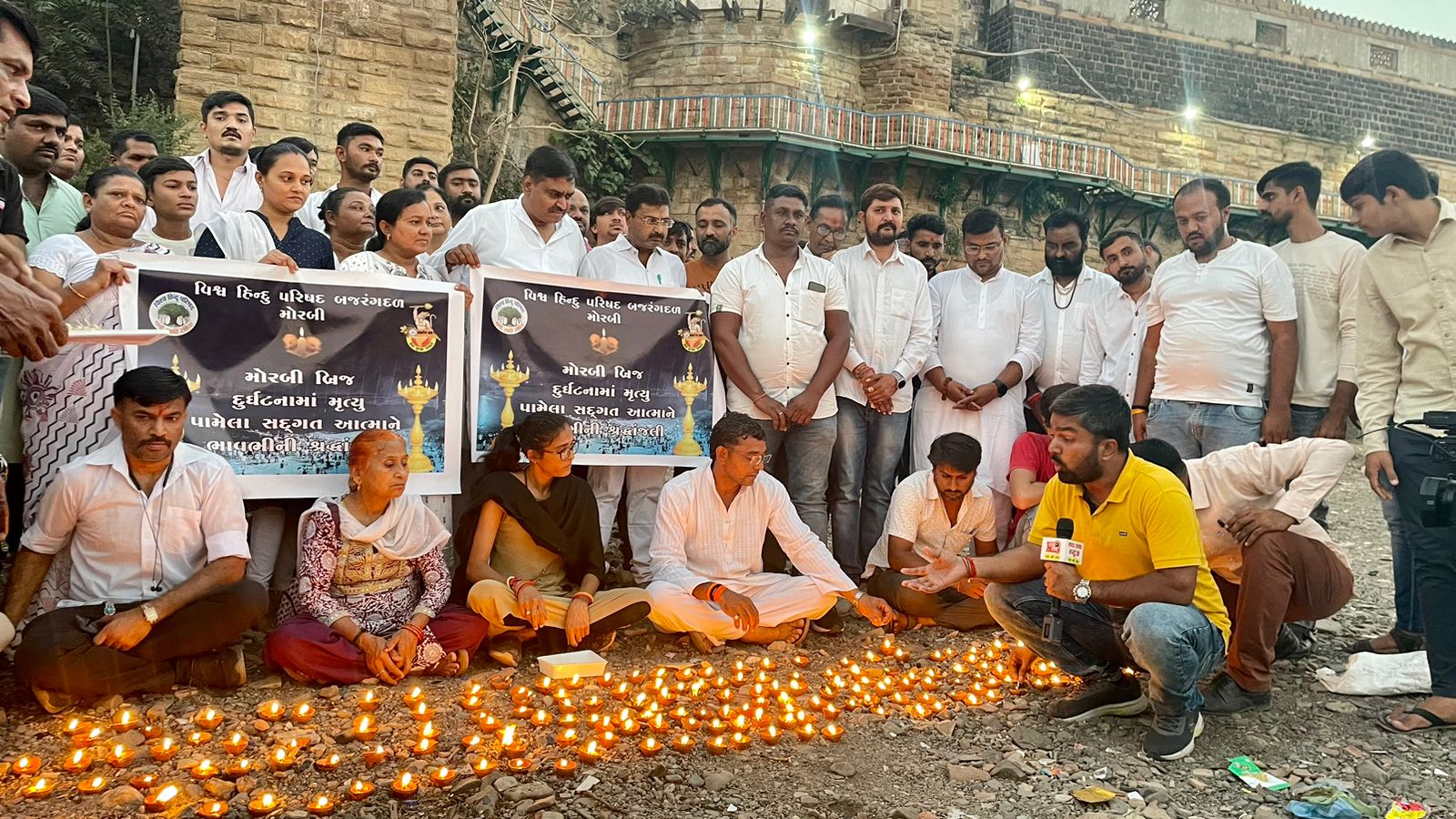 પુલ દુર્ઘટનામાં મૃત્યુ પામેલા દિવંગતોની આત્માની શાંતિ માટે વિશ્વ હિન્દુ પરિષદ મોરબી દ્વારા મૌન રેલી યોજી શ્રદ્ધાંજલિ અપાઈ