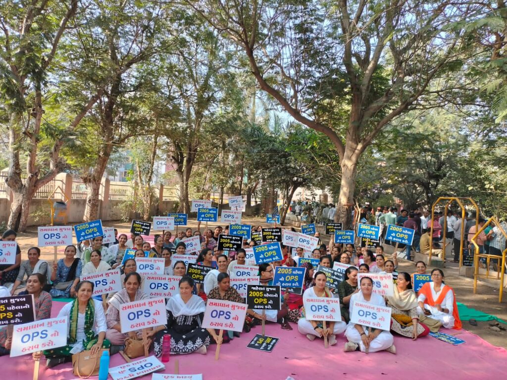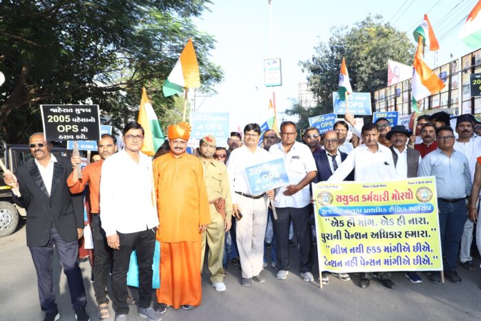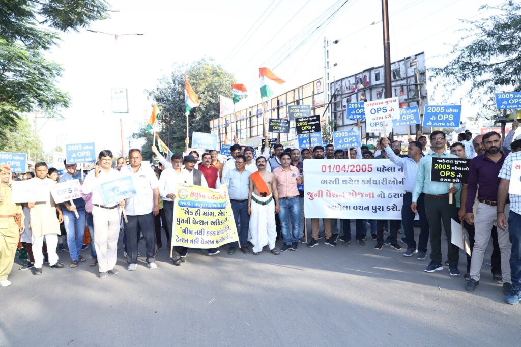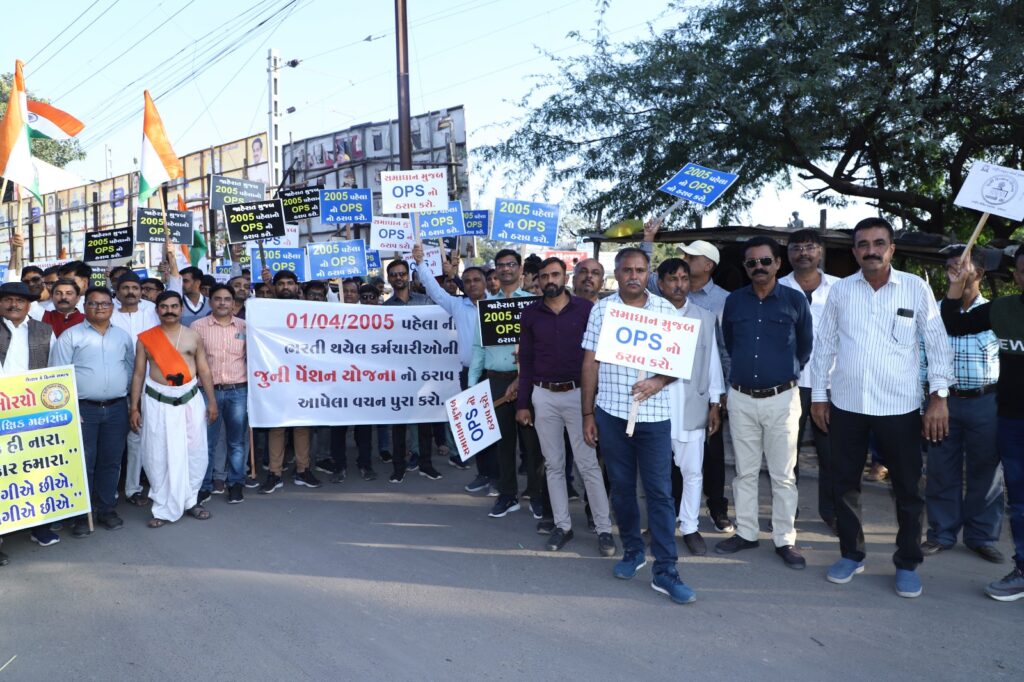 મોરબી,ગુજરાત રાજ્યના શિક્ષકો સહિતના અન્ય વિભાગના કર્મચારીઓ છેલ્લા બે વર્ષથી જૂની પેન્શન યોજના યોજના પુન:લાગુ કરવા સહિતના અનેક પ્રશ્નો માટે લડત ચલાવી રહ્યા છે.છેલ્લે વિધાનસભાની ચૂંટણી પહેલા સરકાર દ્વારા બનાવેલી પાંચ મંત્રીઓની કમિટીએ કર્મચારીઓને જૂની પેન્શન યોજના લાગુ કરવા માટેનો સૈદ્ધાંતિક સ્વીકાર પણ કરેલ હતો છતાં આજદિન સુધી ઠરાવ બહાર પાડેલ ન હોય. બીજી ઓક્ટોબરના ગાંધીજયંતીના રોજ સમગ્ર રાજ્યમાં મૌન રેલી અને ધરણાનું આયોજન કરેલ હતું. ત્યારબાદ જિલ્લા સંગઠન દ્વારા તમામ સાંસદ,ધારાસભ્યો, ચૂંટાયેલા જન પ્રતિનિધિઓ ભાજપ સંગઠનના પ્રમુખોને આવેદનો આપવાના કાર્યક્રમો યોજાયો અને ઘણા બધા રાજનેતાઓએ કર્મચારીઓના સમર્થનમાં પ્રધાનમંત્રી, મુખ્યમંત્રી અને શિક્ષણમંત્રીને ભલામણ પત્રો સમર્થન પત્રો પણ લખી આપેલ છતાં આજદિન સુધી સરકાર દ્વારા કોઈ નક્કર કામગીરી થયેલ ન હોય આગામી 9 મી ડિસેમ્બર – 2023 ના રોજ સમગ્ર રાજયમાં કુલ 11 સ્થાનોની સાથે મોરબી જિલ્લામાં પણ પદયાત્રા અને મહા પંચાયતનું આયોજન કરવામાં આવેલ જેમાં મોરબીના સરદારબાગ ખાતે બપોરે 3.00 વાગ્યે કચ્છ, રાજકોટ, સુરેન્દ્રનગર અને મોરબી જિલ્લાના શિક્ષકો સહિતના અન્ય તમામ વિભાગના કર્મચારીઓ ખુબજ મોટી સંખ્યામાં નવા બસ સ્ટેન્ડની બાજુમાં સરદારબાગ ખાતે એકત્ર થયા ત્યાંથી મૌન પદયાત્રા કરી હાથમાં ટેન્શન નહિ અમને પેન્શન આપો,ONLY OPS, હમારા મિશન પુરાની પેન્શન,NPS નહીં OPS, બુઢાપે કી લાઠી પુરાની પેન્શન,એક હી વિઝન,એક હી મિશન,પુરાની પેન્શન, વગેરે OPS ની માંગ સાથેના પ્લેકાર્ડ લઈ રેલી સ્વરૂપે પંચમુખી હનુમાનજી મંદિર મોરબી-2 ખાતે પહોંચ્યા હતા ત્યાં મહા પંચાયત યોજી હતી જેમાં મહા પંચાયત સમક્ષ સમક્ષ શિક્ષકોએ તમામ કર્મચારીઓ સમક્ષ સત્વરે ઓપીએસ લાગુ કરવા,શિક્ષકોને બી.એલ.ઓ.જેવી બિન શૈક્ષણિક કામગીરીમાંથી મુક્તિ આપવા,HTAT મુખ્ય શિક્ષકોના નિયમો સત્વરે બહાર પાડી બદલી કેમ્પ યોજવા,HTAT ભરતી કેમ્પમાં મન પસંદ જગ્યા ન મળતા જેમને અસંમતી આપેલ હોય, રાજીનામું આપેલ હોય એવા શિક્ષકોના નિયમ મુજબ ઉપધો મંજુર કરવા,ફિક્સ પગારમાં નિમણુંક પામેલ માતૃશક્તિ બહેનોને પ્રસુતિ સબબની રજા કપાત રજા ગણવી નહિ અને નિમણુંક તારીખથી નિયમ મુજબ ઉપધો મંજુર કરવા વગેરે રજૂઆતો મહા પંચાયત સમક્ષ કરી હતી,મહા પંચાયતે આવેદન પત્ર તૈયાર કરી કલેકટર મારફત મુખ્યમંત્રી ભુપેન્દ્રભાઈ પટેલ અને વડાપ્રધાન નરેન્દ્રભાઈ મોદીને આવેદનપત્ર અર્પણ કર્યા હતા,