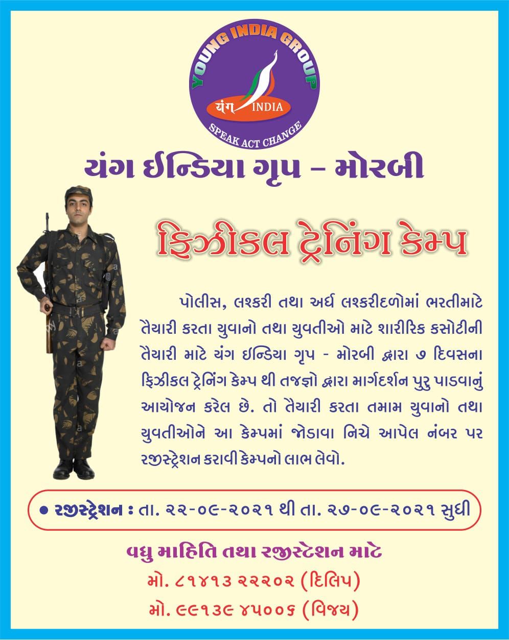 મોરબી યંગ ઇન્ડિયા ગ્રુપે દેશ માટે મરી મીટવાની ભાવનાથી છલોછલ જોશીલા યુવાનોને પોલીસ અને સેનામાં જોડાવવા માટે પ્લેટફોર્મ પૂરું પાડ્યું, ફિઝિકલ ટ્રેનિંગ કેમ્પમાં ભાગ લેવા માટે તા. 22 થી 27 સપ્ટેમ્બર સુધી રજિસ્ટ્રેશન કરાવી શકાશે