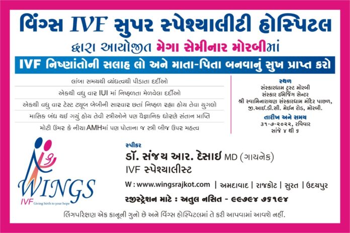 સૌરાષ્ટ્ર – કચ્છનું પ્રથમ નંબરનું એડવાન્સ અને આધુનિક આઇ.વી.એફ.(ટેસ્ટ ટ્યુબ બેબી) સેન્ટર ” વિંગ્સ આઇ.વી.એફ. દ્વારા મોરબી જિલ્લામાં સૌપ્રથમ વખત વ્યંધત્વથી પીડાતા દર્દીઓ માટે સેમીનારનું આયોજન કરવામાં આવ્યું છે. ત્યારે લાંબા સમયથી વ્યંધત્વથી પીડાતા દર્દીઓને IVF નિષ્ણાંત ગાયનેક ડૉ. સંજય આર.દેસાઈનું માર્ગદર્શન મેળવી શકશે.