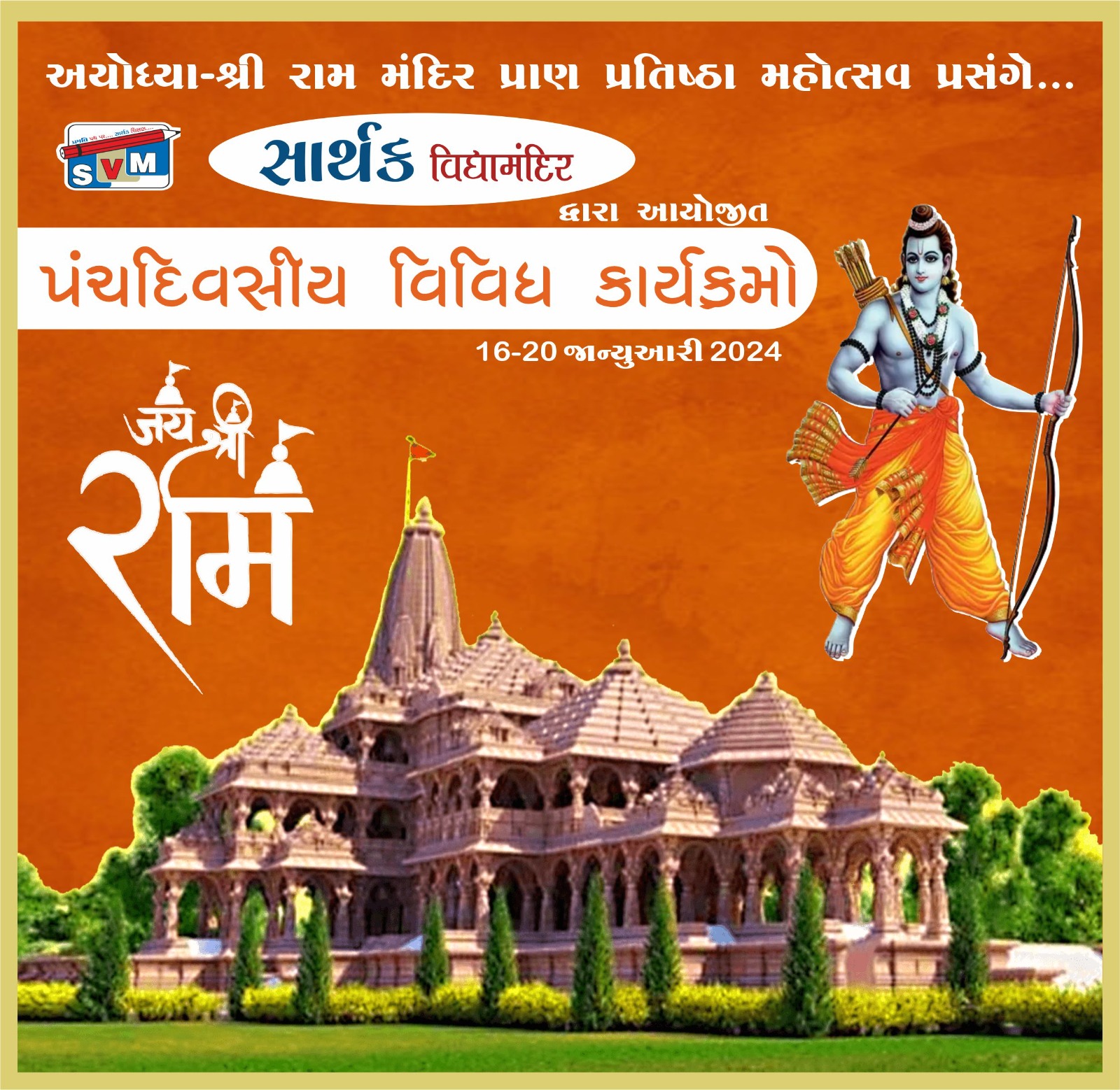 પ્રભુ શ્રી રામ જન્મભૂમિ અયોધ્યા પ્રાણ પ્રતિષ્ઠા અંતર્ગત સાર્થક વિદ્યા મંદિરમાં તા. 16 થી 20 જાન્યુઆરી દરમિયાન પંચદિવસીય કાર્યક્રમનું આયોજન થશે. જેમાં રામ સભા, પૂજિત અક્ષત કળશનું સ્વાગત, શ્રીરામ ભગવાન વિશે વક્તવ્ય ,ગીત ,ધૂન, રામચરિત માનસ પાઠ, વિવિધ લેખકોની વિવિધ રચનાઓના ભાવાર્થ, પ્રેઝન્ટેશન, ભરતનાટ્યમ કથ્થક દ્વારા રામજીના સંસ્કૃત ગીતનું નિરૂપણ ,દીપમાલા તેમજ પ્રાણ પ્રતિષ્ઠાનું live પ્રસારણ વગેરે કાર્યક્રમ યોજાશે.
