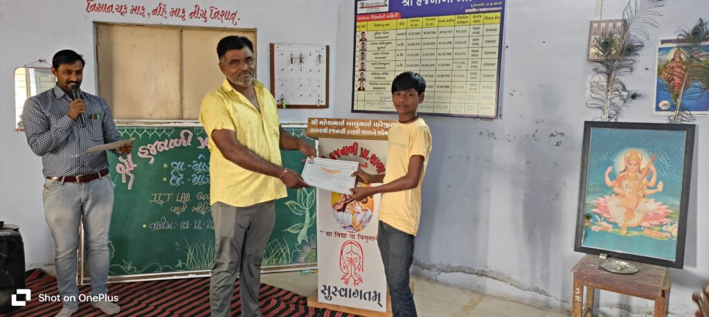 હજનાળી પ્રાથમિક શાળામાં ICT લેબ નું ઉદઘાટન અને વાલી મિટીંગ યોજાઈ સરકારશ્રી દ્વારા SOE અંતર્ગત ICT - કમ્પ્યુટર લેબ આપવામાં આવી છે. જેમાં 15 કમ્પ્યુટર સેટ શાળામાં આપવામાં આવેલ છે. જે અંતર્ગત આજ રોજ તારીખ 9/12/2023 ને શનિવારના રોજ તેનું ઉદઘાટન ગામના યુવા સરપંચ શ્રી મહેશભાઈ પારેજીયા ના હસ્તે કરવામાં આવ્યું. ઉપરાંત બાળકોને આગામી સમયમાં કમ્પ્યુટર દ્વારા જે આધુનિક શિક્ષણ આપવામાં આવશે તેનાથી સરપંચશ્રી તથા તમામ ગ્રામજનોને અવગત કરવામાં આવ્યા. આ સાથે એક વાલી મિટીંગ નું પણ આયોજન કરવામાં આવ્યું હતું. જેમાં બહોળી સંખ્યામાં વાલીઓ હાજર રહ્યા હતા. જેમાં બાળકોની હાજરી, NMMS પરીક્ષા બાબત, પ્રવાસ, પ્રમાણપત્ર એનાયત, બચતબેંકની જાળવણી, સતત શિક્ષકોનો સંપર્ક વગેરે મુદ્દાની વાલી સાથે ચર્ચા કરવામાં આવી. આ તમામ બાબતે વાલીઓનો સારો ઉત્સાહ જોવા મળ્યો હતો. આ વાલી મિટીંગ નું સંચાલન શાળાના આચાર્યશ્રી સંજયભાઈ ગઢવી દ્વારા કરવામાં આવ્યું હતું. આ કાર્યક્રમને સફળ બનાવવા માટે શાળાના શિક્ષકો ગોરધનભાઈ પરમાર, મોહિતભાઈ ચનિયારા, સપનાબેન પીઠડીયા, અશ્વિનભાઈ ચાવડા તથા દક્ષાબેન મકવાણા દ્વારા ભારે જહેમત ઉઠાવવામાં આવી હતી. અંતમાં કાર્યક્રમની આભાર વિધિ શાળાના શિક્ષકશ્રી અમિતભાઈ ખાંભરા દ્વારા કરવામાં આવી હતી.