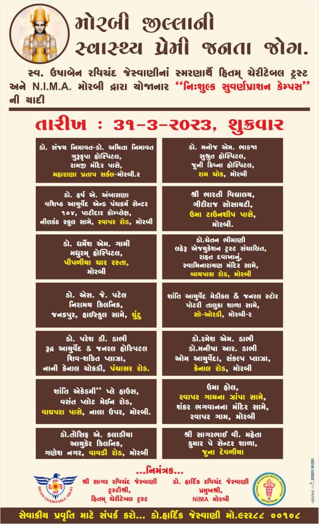 મોરબી: સ્વ. ઉષાબેન રવિચંદ જેસ્વાણીના સ્મરણાર્થે હિતમ ચેરિટેબલ ટ્રસ્ટ અને NIMA મોરબી દ્વારા મોરબીના વિવિધ 14 સ્થળે 31 માર્ચના રોજ નિ:શુલ્ક સુવર્ણ પ્રાશન કેમ્પ યોજાશે.
