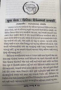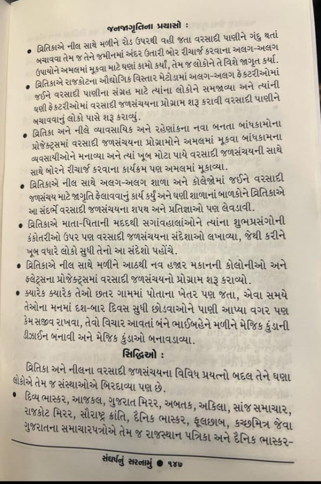 આ પુસ્તક માં સૌથી નાની ઉંમરે વ્રીતીકા રાજાણી તેના ભાઈ નીલ સાથે મળી છેલ્લા 4.5-5 વર્ષ થી “Save Water Save Life ” પર કામ કરે છે. તેની સ્ટોરી લેવામાં આવી. હજારો લોકોને, બાળકોને, સ્કૂલ ના વિદ્યાર્થીઓ ને પાણી બચાવાના મહત્વ નું કાર્ય બને ભાઈ બેહેન દ્વારા કરવામાં આવે છે. “સંઘર્ષનું સરનામું” કોઈ ને બૂક ખરીદવી હોઈ તો 250/- એમની કિંમત છે. 9316079971 આ નંબર ઉપર કોન્ટેક્ટ કરશે.