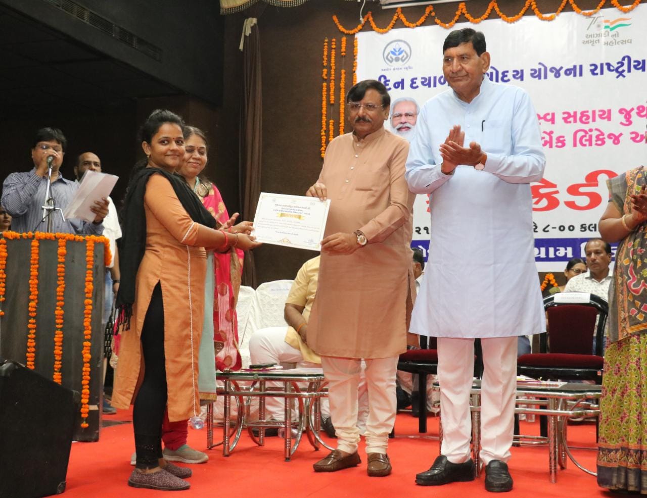 આ પ્રસંગે શ્રેષ્ઠ કામગીરી કરનાર બેંક સખી તેમજ બેંકર્સનું મહાનુભાવો હસ્તે પ્રમાણપત્ર આપી સન્માન કરાયું હતું તેમજ જિલ્લાના વિવિધ ગામોમાંથી ઉપસ્થિત રહેલ સખીમંડળ તથા ગ્રામ સંગઠનોને ચેક તથા મંજૂરી પત્રો એનાયત કરાયા હતા. આ પ્રસંગે જિલ્લા વિકાસ અધિકારી પરાગ જે. ભગદેવ, જિલ્લા ગ્રામ વિકાસ એજન્સીના નિયામક મીતાબેન જોષી, જિલ્લા પંચાયતના ઉપપ્રમુખ જાનકીબેન કૈલા, અગ્રણી જિગ્નેશભાઇ કૈલા, કે.કે. પરમાર સહિતના નગરપાલિકા, તાલુકા પંચાયત, જિલ્લા પંચાયતના ચૂંટાયેલા સદસ્યો તેમજ વિવિધ બેંકના મેનેજરો તથા બહોળી સંખ્યામાં જિલ્લાના વિવિધ તાલુકાઓમાંથી ઉપસ્થિત રહેલ સખી મંડળના બહેનો હાજર રહ્યા હતા.